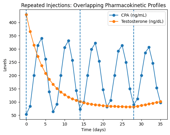 When testosterone is administered repeatedly, each new dose is introduced before the previous one has been fully eliminated. This results in dose overlap, a pharmacokinetic phenomenon known as superposition. Rather than producing a flat concentration, repeated dosing creates a series of overlapping curves, where residual levels from prior injections combine with newly administered hormone.